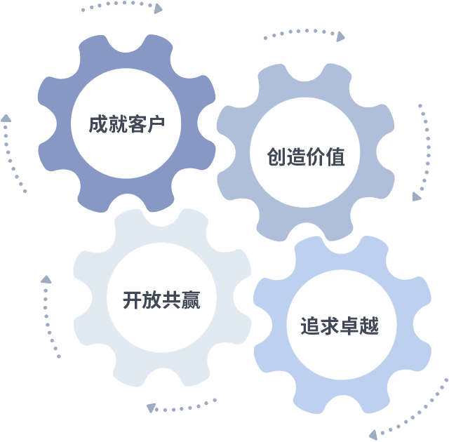 成就客户是一切决策的出发点,,创造价值是衡量所有工作的标准,,,追求卓越是我们做事做人的态度,,开放共赢是我们的格局也是最终的结果。。。。价值观的齿轮环环相扣,,,推动着组织里的每个人不断向前。。。。